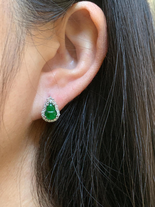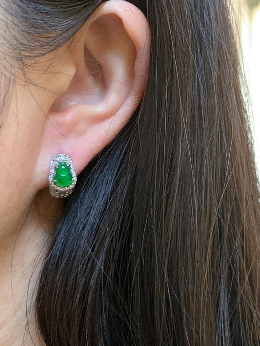 Natural Grade A Guatemalan Icy Translucent Vibrant Green Jade Jadeite Gourd Hulu Huggie Hoop Earrings Sterling Silver 天然冰危绿翡翠葫芦银镶耳包 DHL110