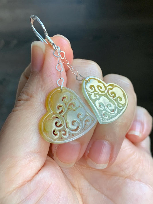 Natural Grade A Icy Highly Translucent Vibrant Yellow Jade Jadeite Openwork Engraved Heart Earrings Sterling Silver 天然冰黄翡翠镂空雕爱心足银耳钩耳吊BMH496A