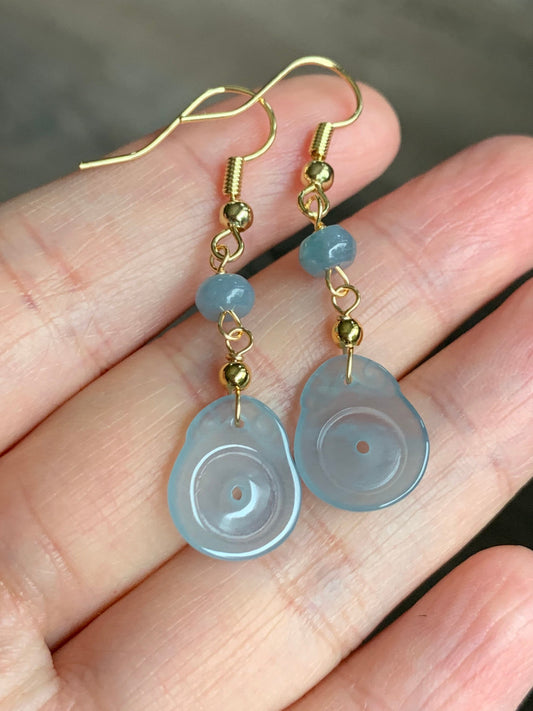 Natural Guatemalan Highly Translucent Light Sky Blue Jadeite Donut Ping An Kou Earrings 14K yellow gold plated 天然冰危蓝翡翠平安扣包金耳吊