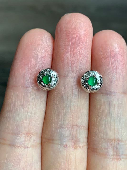 Natural Guatemalan Grade A Icy Highly Translucent Vibrant Green Jadeite Round Stud Earrings Sterling Silver 天然冰危绿翡翠蛋面银镶耳钉