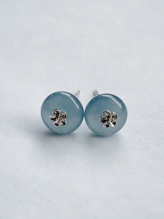 Certified Guatemalan Natural Icy Highly Translucent Light Blue Jadeite Drum Bead Stud Earrings 18K White Gold 天然冰危蓝水翡翠鼓珠K金镶嵌耳钉 1643
