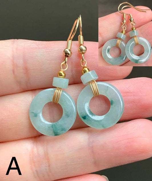 Natural Icy Translucent light green Jadeite w/ Green Marbling Ping An Kou Donut Dangle Earrings 14K Gold Plated 天然冰飘花翡翠平安扣包金耳吊