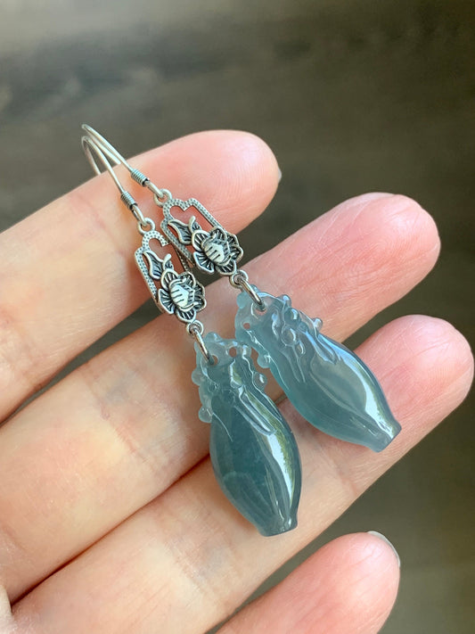 Natural Guatemalan Icy Translucent Gelatinous Dark Dusty Blue Jadeite Carved Flower Vase Dangle Earrings Sterling Silver 天然冰胶危蓝翡翠宝瓶银耳钩