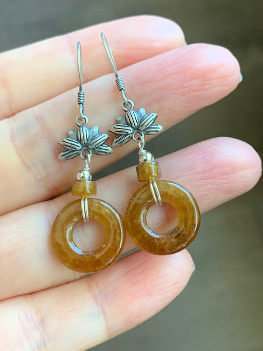 Natural Icy Highly Translucent Rich Yellow Jadeite Ping An Kou Donut Dangle Earrings S925 Sterling Silver 天然A货冰透鸡油黄翡翠平安扣银耳吊