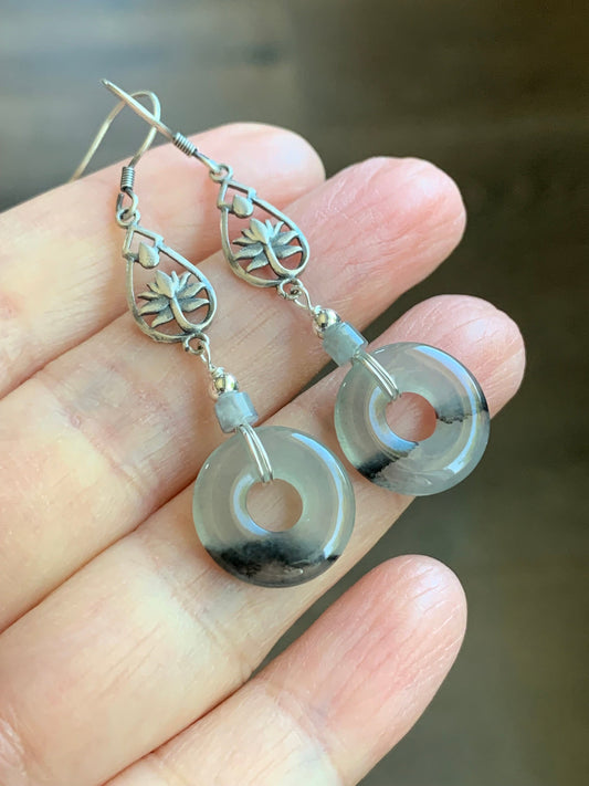 Natural Icy Highly Translucent Gelatinous Wuji Jadeite Ping An Kou Donut Dangle Earrings S925 Sterling Silver 天然A货冰胶乌鸡翡翠平安扣银耳吊