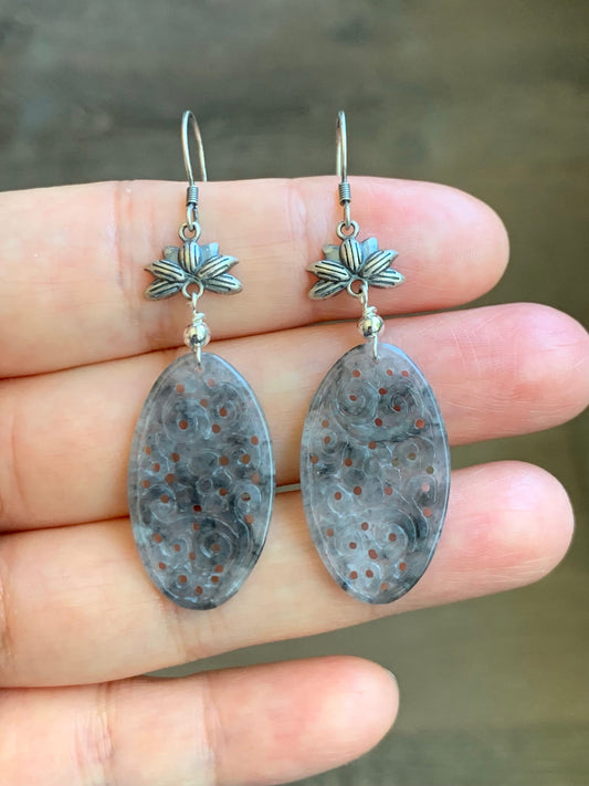 Natural Icy Translucent Wuji Jadeite w/ Openwork Engraving Dangle Earrings 925 Sterling Silver 天然冰乌鸡翡翠镂空雕银耳吊