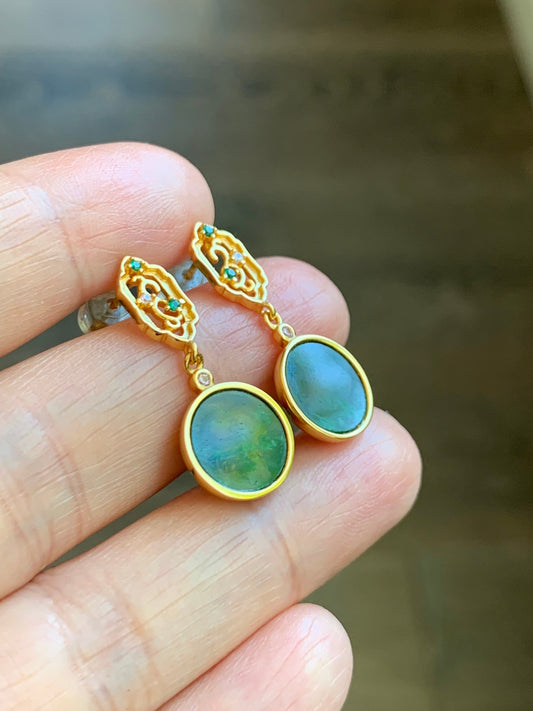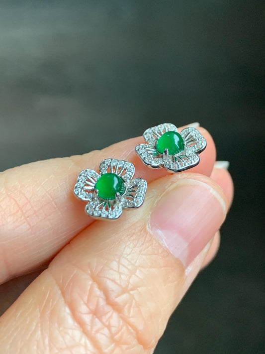 Guatemalan Natural Highly Translucent Icy Green Jadeite Stud Earrings S925 Sterling Silver 天然危地马拉高冰绿翡翠镶嵌耳钉