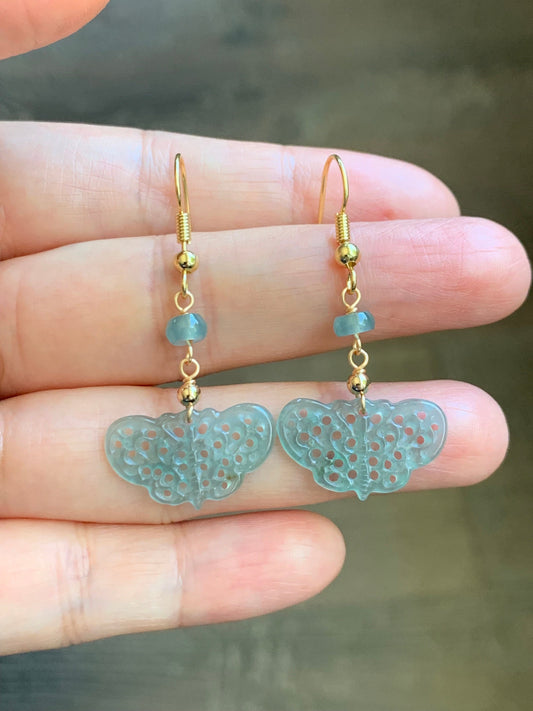 Natural Guatemalan Icy Highly Translucent Light Blue Jadeite Openwork Engraved Butterfly Dangle Earrings 14K gold plated 天然冰危蓝翡翠镂空雕蝴蝶包金耳钩