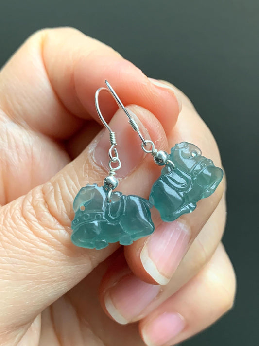 Natural Guatemalan Grade A Icy Highly Translucent Dark Teal Blue Jadeite Carved Tang Horse Dangle Earrings Sterling Silver 天然冰危蓝翡翠小唐马银耳钩