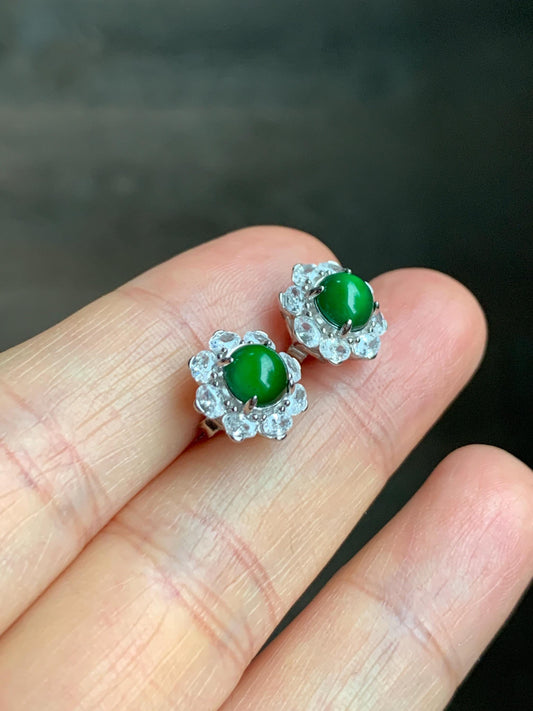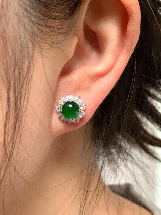 Natural Guatemalan Grade A Icy Highly Translucent Vibrant Green Jadeite Round Stud Earrings Sterling Silver 天然冰危绿翡翠蛋面银镶耳钉 ZHL98