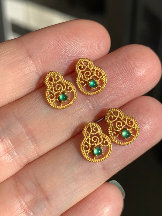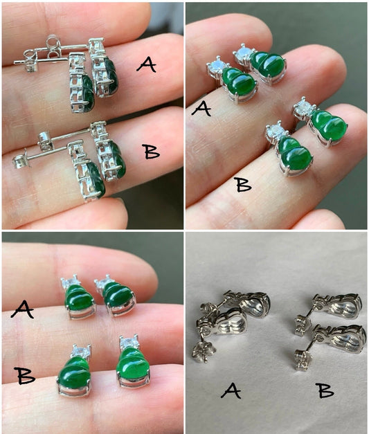Natural Guatemalan Premium Icy Vibrant Green Jadeite Hulu/Gourd Stud Earrings S925 Silver Gold Satin Finish 天然高危冰绿翡翠葫芦银镶耳钉