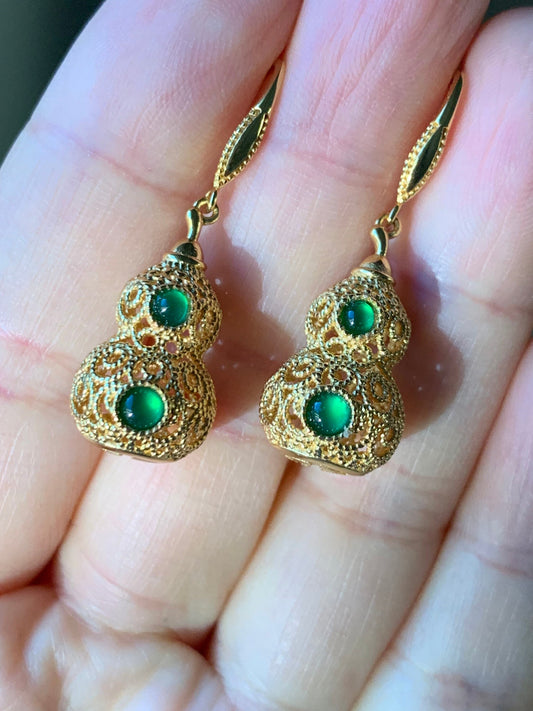 Natural Guatemalan Premium Green Jadeite 3D Hulu Gourd Dangle Earrings S925 Silver Yellow Gold Finish 天然高冰危绿翡翠银镶立体葫芦吊坠