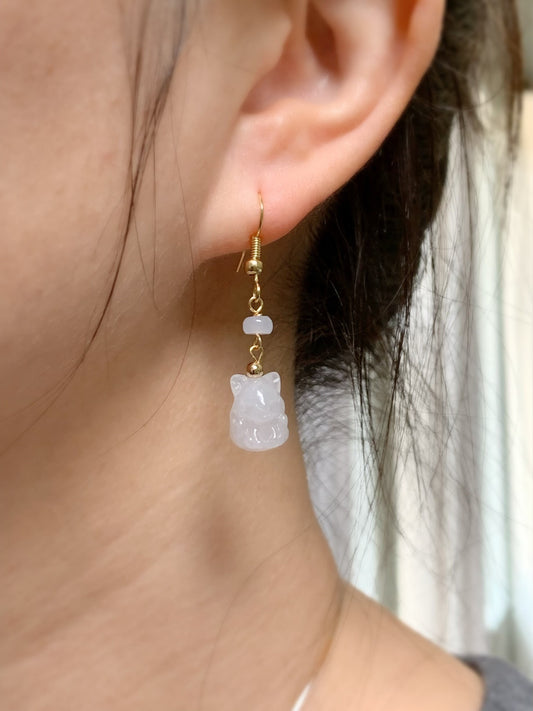 Natural Icy Translucent & Gelatinous White Jadeite 3D Carved Nine-Tailed Fox Dangle Earrings 14K Gold Plated 天然白冰起胶翡翠九尾狐狸包金耳钩