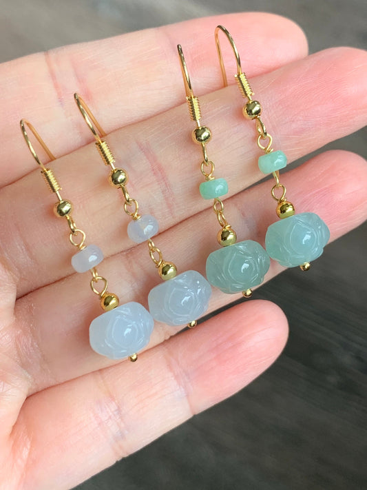 Natural Icy Translucent Gelatinous White & Green Jadeite Carved Lotus Flower Dangle Earrings 14K Gold Filled 天然冰胶翡翠莲花珠耳钩