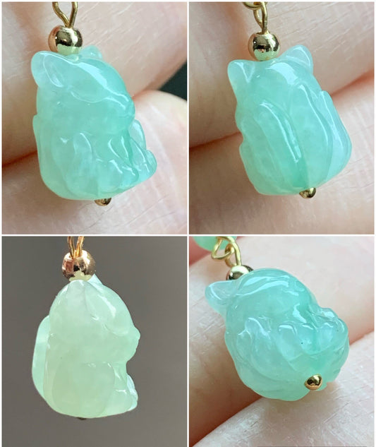 Natural Icy Translucent & Gelatinous Light Green Jadeite 3D Carved Nine-Tailed Fox Dangle Earrings 14K Gold Plated 天然冰晴翡翠九尾狐狸包金耳钩