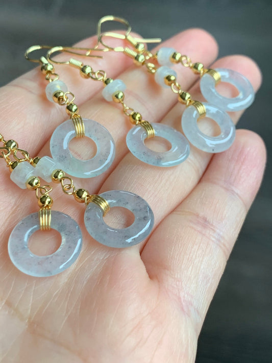 Natural Icy Highly Translucent Wuji Jadeite Ping An Kou Donut Dangle Earrings 14K Gold Plated 天然起冰起光冰乌鸡平安圈耳吊