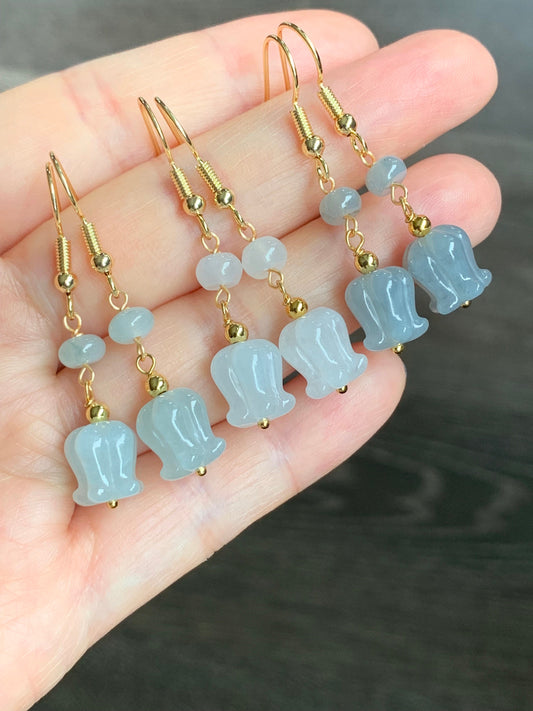 Natural Icy Translucent Gelatinous Jadeite Carved Magnolia Flower Dangle Earrings 14K Gold Plated 天然冰胶翡翠玉兰花包金耳钩