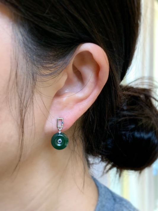 Certified Natural Guatemalan Icy Translucent Teal Green Jadeite Mini Donut Ping An Kou Sapphire Earrings Sterling Silver 天然冰危绿翡翠篮宝石迷你平安扣耳钉