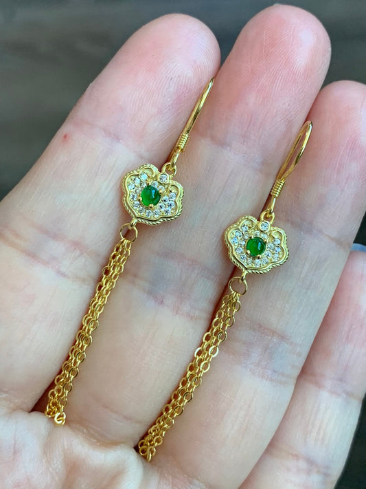 Natural Guatemalan Icy Highly Translucent Vibrant Green Jadeite Ruyi Dangle Earrings S925 Sterling Silver Gold Finish 天然冰危绿翡翠如意流苏款耳钩