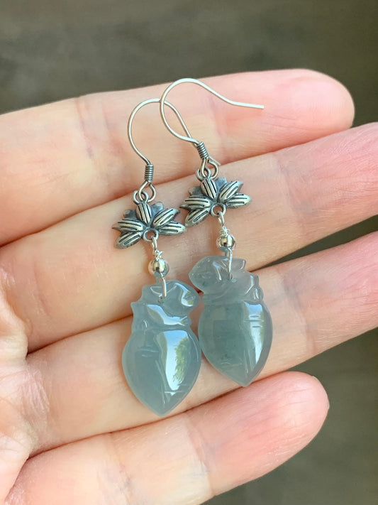 Natural Guatemalan Icy Translucent Gelatinous Light Blue Jadeite Carved Rabbit & Carrot Dangle Earrings Sterling Silver 天然冰胶危浅蓝翡翠胡萝卜兔银耳钩