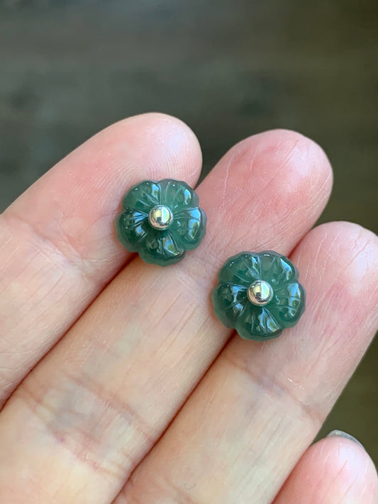Natural Guatemalan Icy Translucent Gelatinous Deep Teal Green Jadeite Hibiscus Flower Stud Earrings Sterling Silver 天然冰危湖水绿翡翠朱槿花银耳钉 A