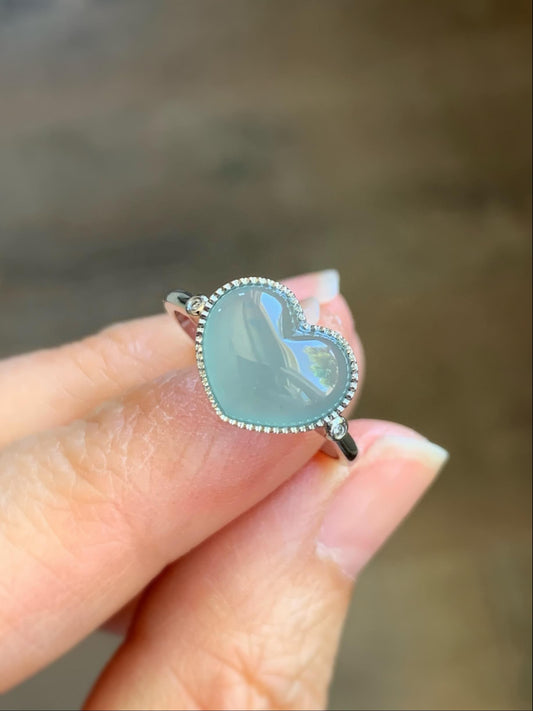 Certified Natural Icy Translucent Light Blue Jadeite Heart Ring 18K White Gold Natural Diamonds sz 7.25 2.74g 天然冰胶淡蓝翡翠爱心镶嵌戒指 8602
