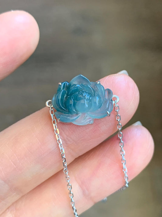 Certified Natural Icy Translucent Blue Jeans Marbled Jadeite Lotus Flower Bracelet 18K White Gold 6.25"-7" 天然冰胶牛仔蓝飘花翡翠莲花镶嵌手链 8625