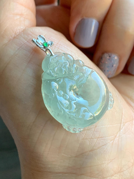 Certified Natural Premium Icy Light Green Jadeite Lotus Flower Goldfish Ping An Kou Donut Pendant Sterling Silver 天然冰胶起光晴底翡翠莲花鱼吊坠