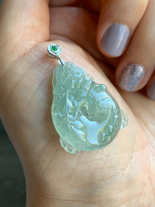 Certified Natural Grade A Icy Translucent Gelatinous Light Purple Jadeite Large Gourd Hulu Pendant 14K White Gold 7.61g 天然冰淡紫翡翠葫芦镶嵌吊坠 9454