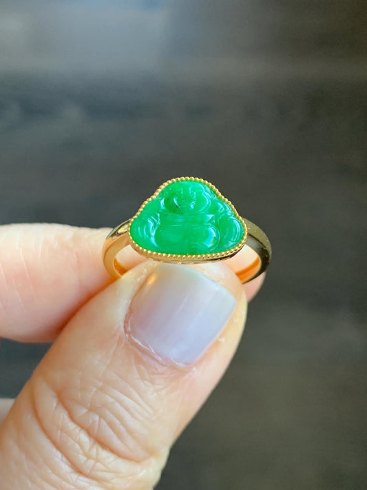 Certified Grade A Natural Icy Translucent Bright Vibrant Green Jadeite Buddha Ring Solid 18K Yellow Gold Size 7.25 US 2.57g 天然冰阳绿翡翠佛公镶嵌戒指