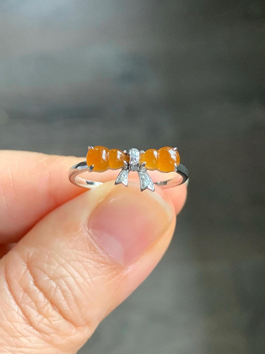 Certified Natural Grade A Icy Highly Translucent Vibrant Orange Yellow Jadeite Double Gourd Ring 14K White Gold Size 7.25 天然正冰红翡双葫芦镶嵌戒指 6676