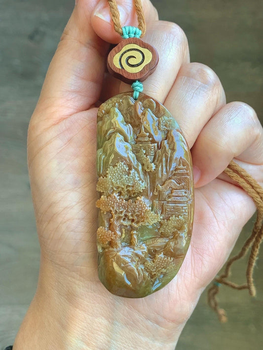 Large Certified Natural Grade A Icy Translucent Brownish Red & Dark Green Jadeite Shan Shui Pendant Rope Necklace 32” 天然冰红加绿翡翠山水牌吊坠 9966