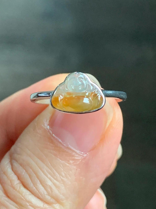 Certified Natural Grade A Icy Highly Translucent Bicolored Yellow Marbled Jadeite Buddha Ring 14K White Gold Size 7.25 天然正冰黄翡翠佛公14K镶嵌戒指 6675