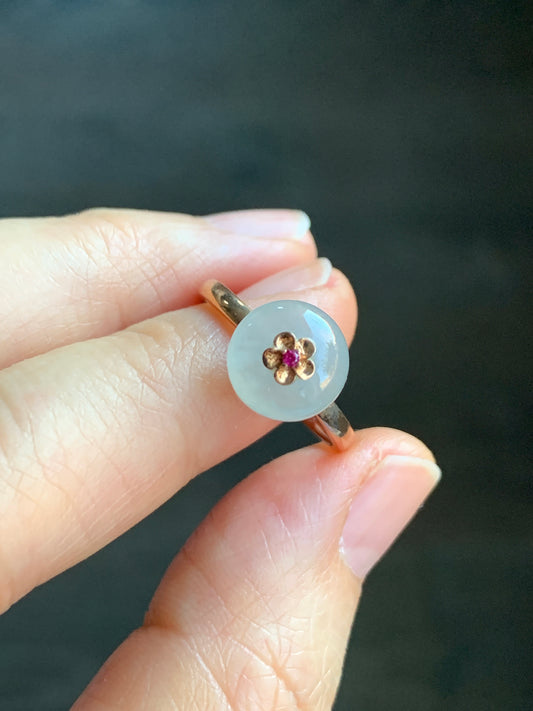 Certified Grade A Icy Highly Translucent Gelatinous White Jadeite Drum Bead Ring 18K Rose Gold & Ruby Sz 7 US 天然正白冰翡翠鼓珠红宝石K玫镶嵌戒指