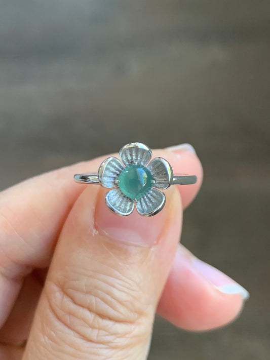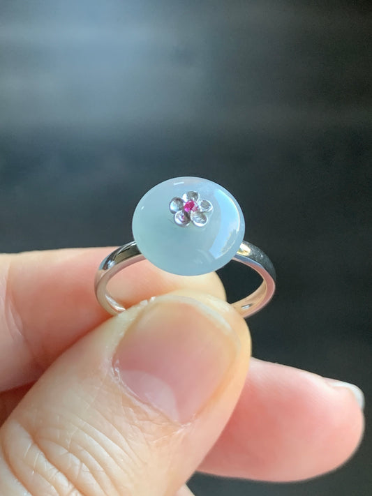 Certified Natural Icy Translucent Teal Green Jadeite Cherry Blossom Design Ring 18K White Gold size 7 天然冰湖水绿翡翠梅花白金镶嵌戒指