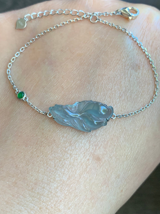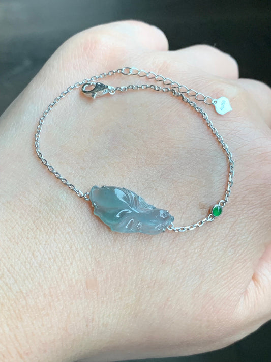 Certified Natural Guatemalan Icy Highly Translucent Dusty Blue Jadeite Betta Fish Bracelet 18K White Gold 6.25”-7.25” 天然冰危淡蓝翡翠斗鱼金镶手链 345