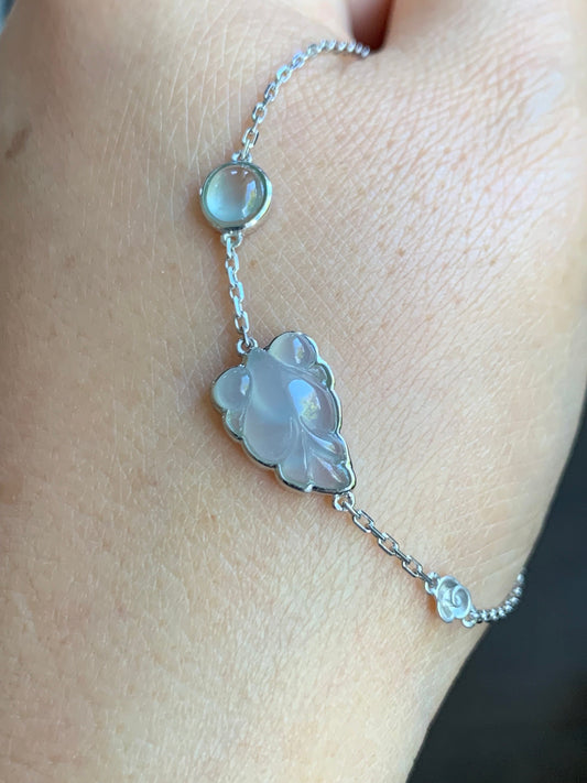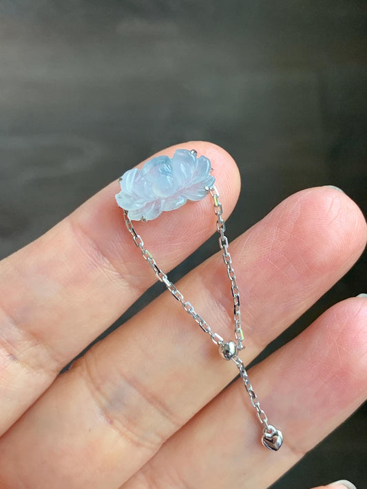 Certified Natural Icy Highly Translucent White & Teal Blue Jadeite Lotus Flower Chain Ring 18K White Gold Adjustable 天然冰飘花翡翠莲花镶嵌戒指