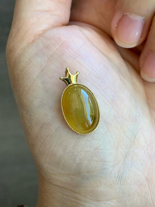 Certified Natural Icy Translucent Intense Yellow Jadeite Oval Cabochon Pendant Crown Design 18K Yellow Gold 天然起冰油黄翡翠皇冠镶嵌吊坠 8627