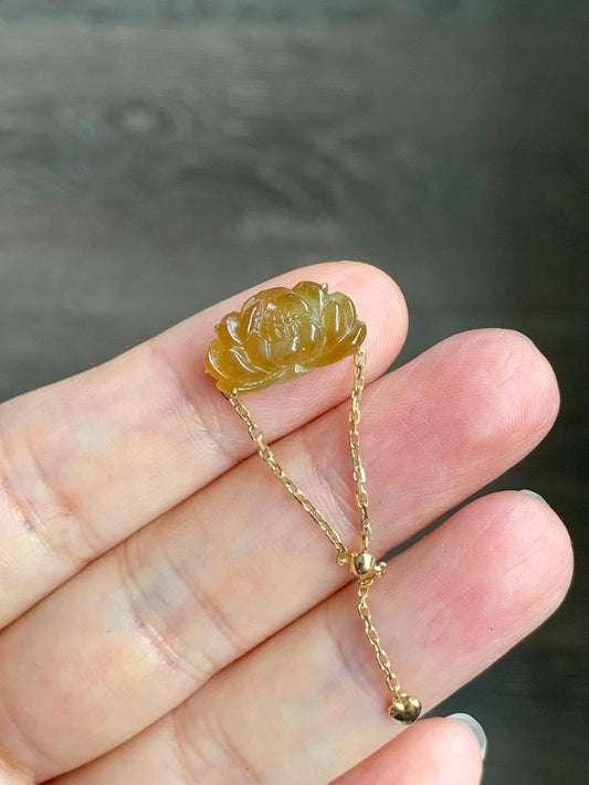 Certified Natural Icy Highly Translucent Golden Yellow Jadeite Lotus Flower Chain Ring 18K Yellow Gold Adjustable 天然冰黄翡翠莲花镶嵌戒指 042