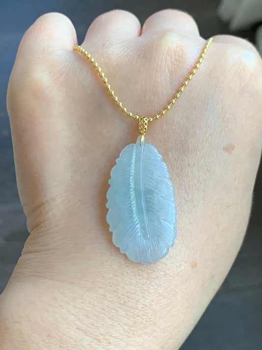 Natural Icy Translucent Light Green Jadeite Carved Feather Pendant 18K Yellow Gold 天然冰淡晴底翡翠羽毛镶嵌吊坠 B830