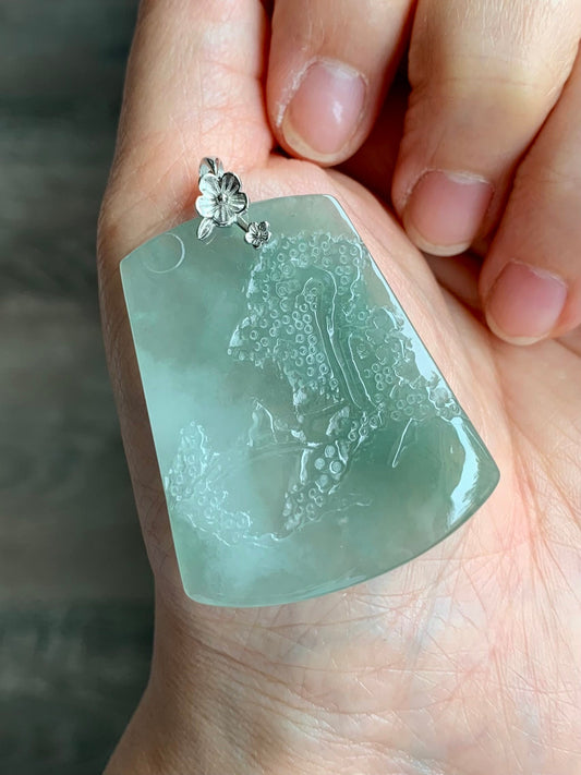 Large Natural Icy Translucent Gelatinous Light Green Jadeite Carved Shan Shui Pai Landscape Pendant Sterling Silver 天然冰晴翡翠精工雕山水牌