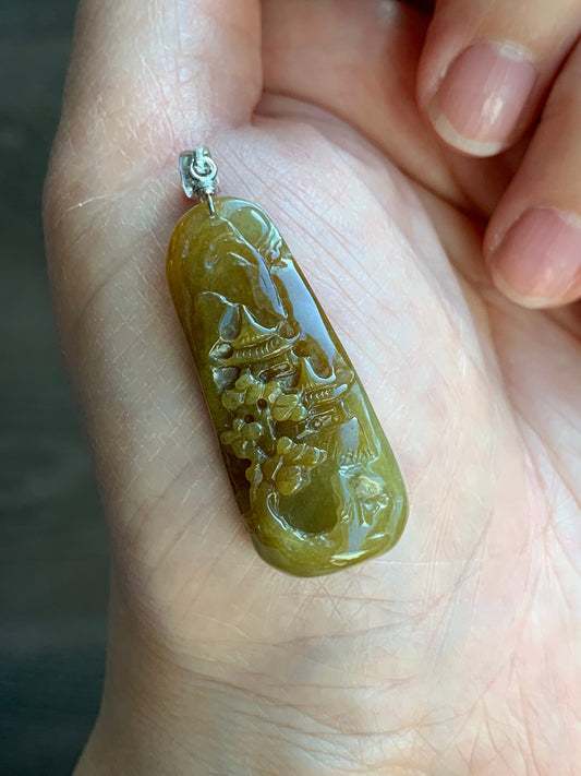 Natural Icy Translucent Deep Rich Yellow Jadeite Shan Shui Landscape Pendant Sterling Silver Bail 7g 天然冰油黄翡翠山水牌吊坠