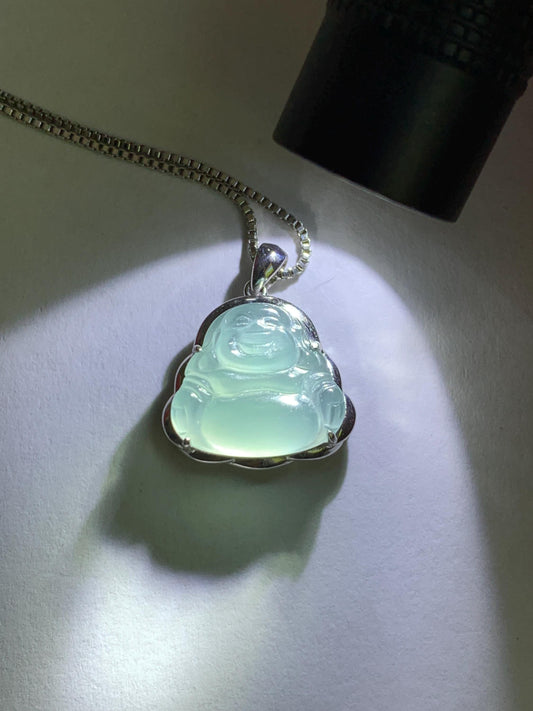 Certified Natural Guatemalan Icy Highly Translucent Light Teal Blue Jadeite Buddha Petite Pendant Sterling Silver 天然老种高冰危蓝绿翡翠起光佛公镶嵌吊坠 3023