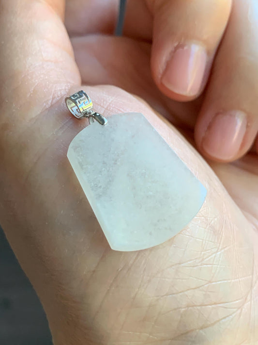 Natural Moxisha Icy Translucent White Jadeite Trapezoid Wu Shi Pai Blessing Amulet Pendant 18K White Gold 3g 天然白冰莫西沙翡翠梯形无事牌镶嵌吊坠