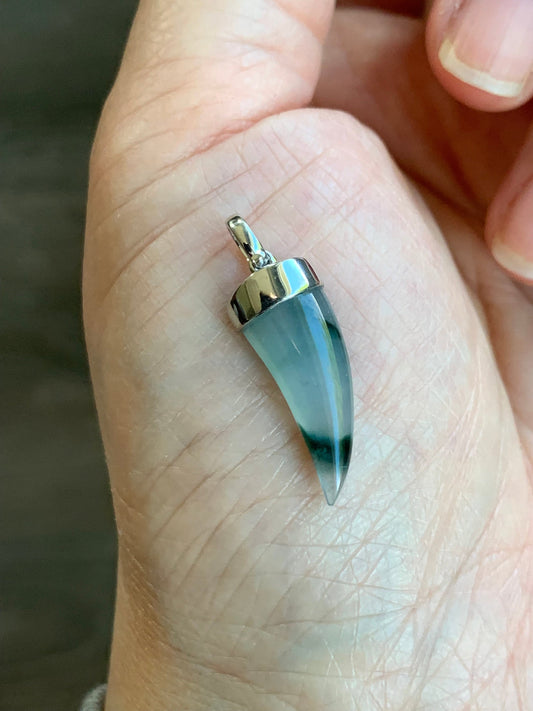 Certified Natural Icy Translucent Jadeite w/ Dark Green Marbling Dragon Tooth Pendant 18K White Gold 天然老种冰胶飘花翡翠龙牙镶嵌吊坠 3290