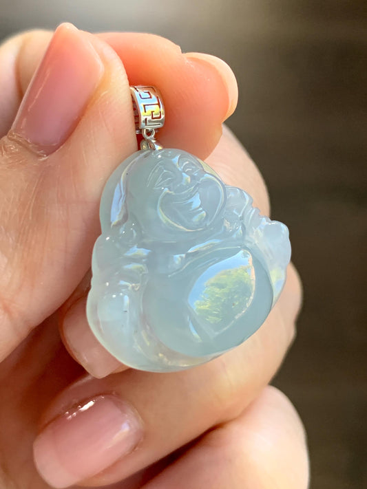 Certified Natural Icy Translucent Pale Blue Jadeite Carved Buddha Pendant 18K White Gold 天然冰淡蓝翡翠佛公镶嵌吊坠 3011