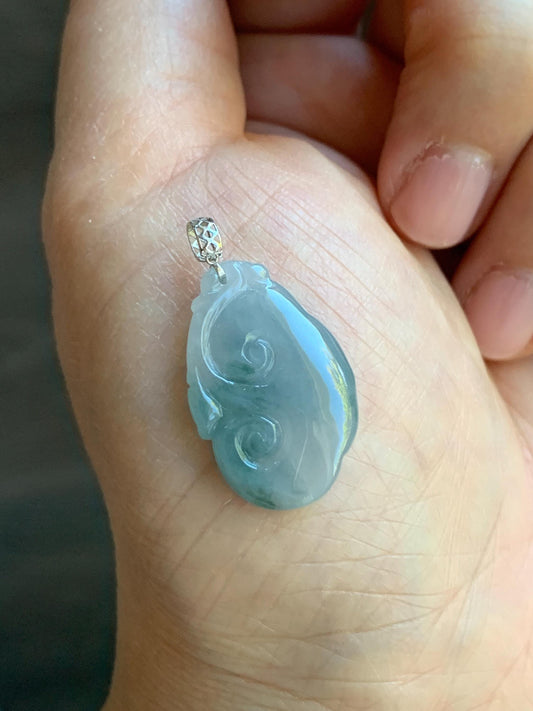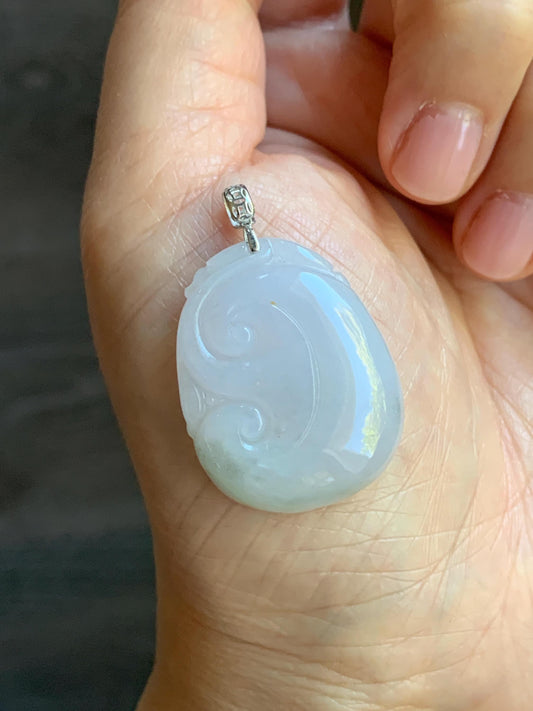 Petite Natural Icy Translucent Gelatinous Light Purple Teal Blue Marbled Jadeite Carved Ruyi Pendant 18K White Gold 天然淡冰紫飘花翡翠如意吊坠