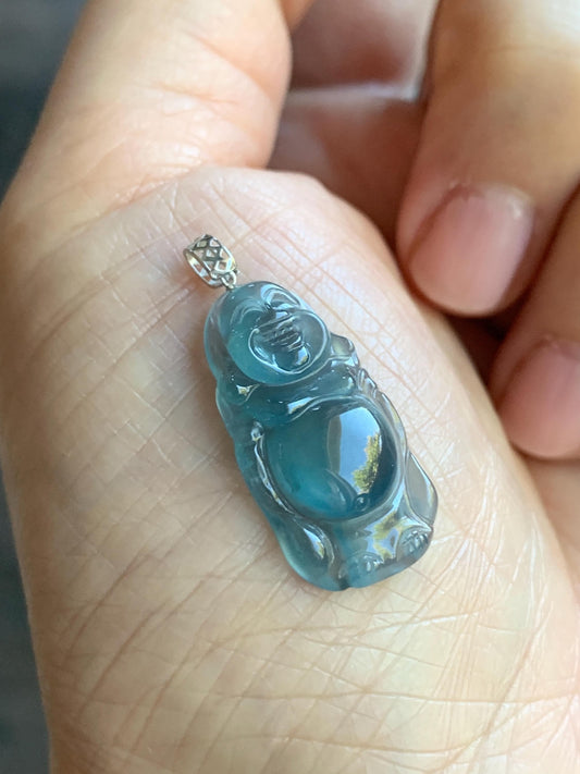 Petite Natural Guatemalan Premium Icy Highly Translucent Indigo Blue Jadeite Standing Buddha Pendant 18K White Gold 天然冰危蓝起光翡翠站佛公镶嵌吊坠 C