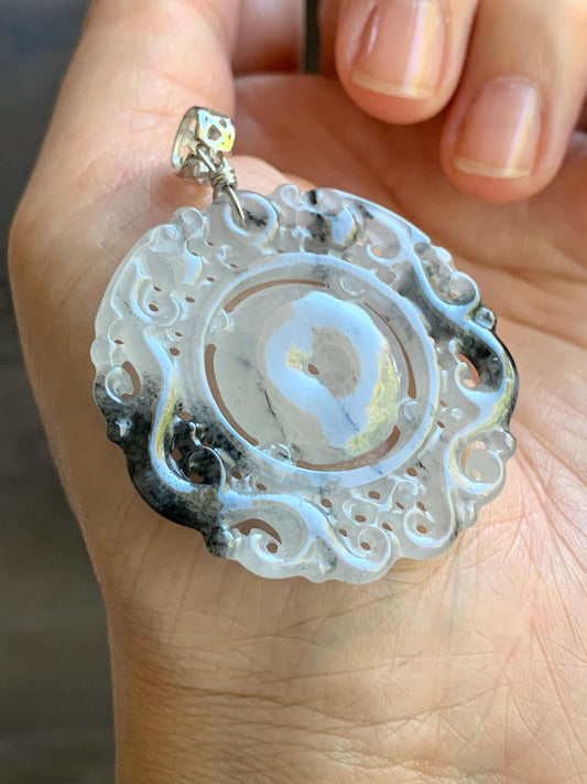 Natural Icy Translucent Gelatinous Wuji Jadeite Openwork Engraved Double Dragon Donut Pendant Sterling Silver 天然冰胶乌鸡翡翠双龙护主平安扣吊坠 B