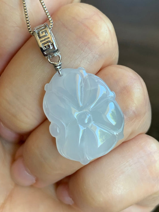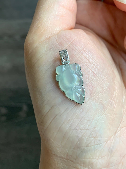 Natural Icy Translucent Gelatinous White Jadeite Carved Lotus Leaf Lily Pad Pendant S925 Sterling Silver 天然白冰胶翡翠荷叶吊坠